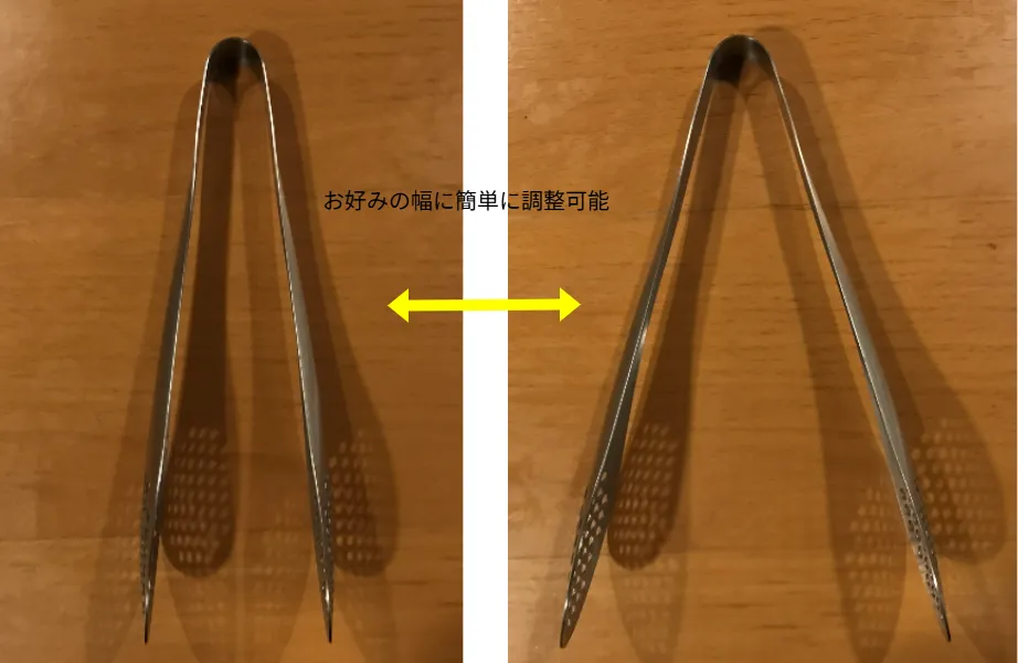 柳宗理のステンレストングは、向きを変えると形や大きさを問わず食材をしっかりつかめる便利なキッチンツールです(上の写真を参照)。パスタやチャーシューなどの大きな食材から豆や薬味などの小さなものまで、ストレスなくつかめます。