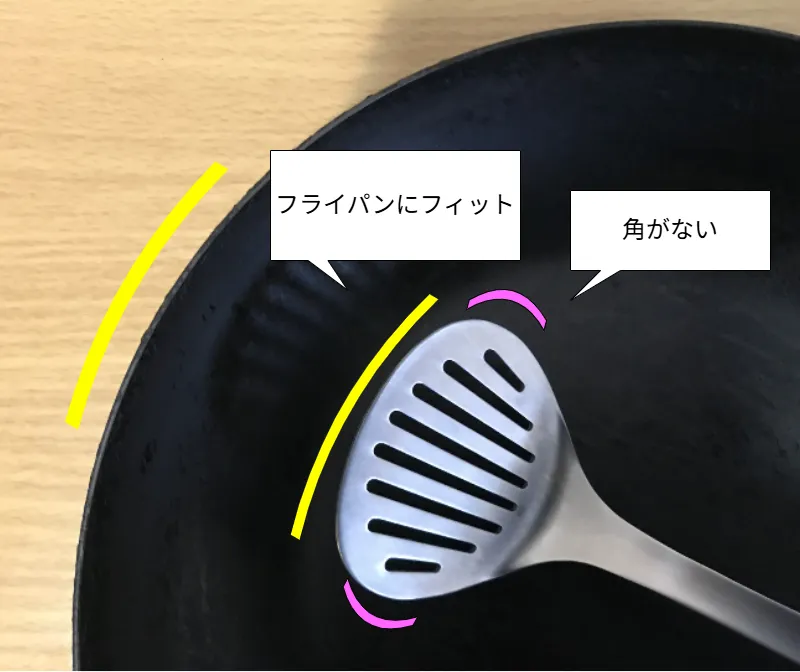 この温かみのあるデザインに惹かれる方も多いでしょうが、実は機能的にも非常に理にかなっているのです。まず、フライパンのフチに沿ってスムーズに移動し、どこからでも具材をすくい取りやすいこと。台形ターナーのように、角がフライパンにカツカツとあたってうまい具合の角度で差し込めない……といったストレスがありません。