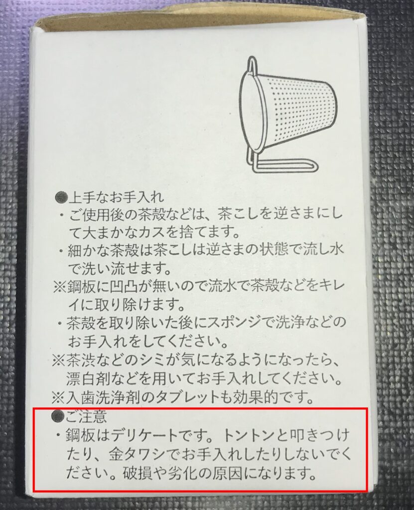 今まで使っていたメッシュ加工の茶こしは、線材の隙間に茶葉が入り込んでしまい、スポンジでこすってみたり上から叩いてみたりとお手入れが面倒でしたが、そのストレスから解放されました。