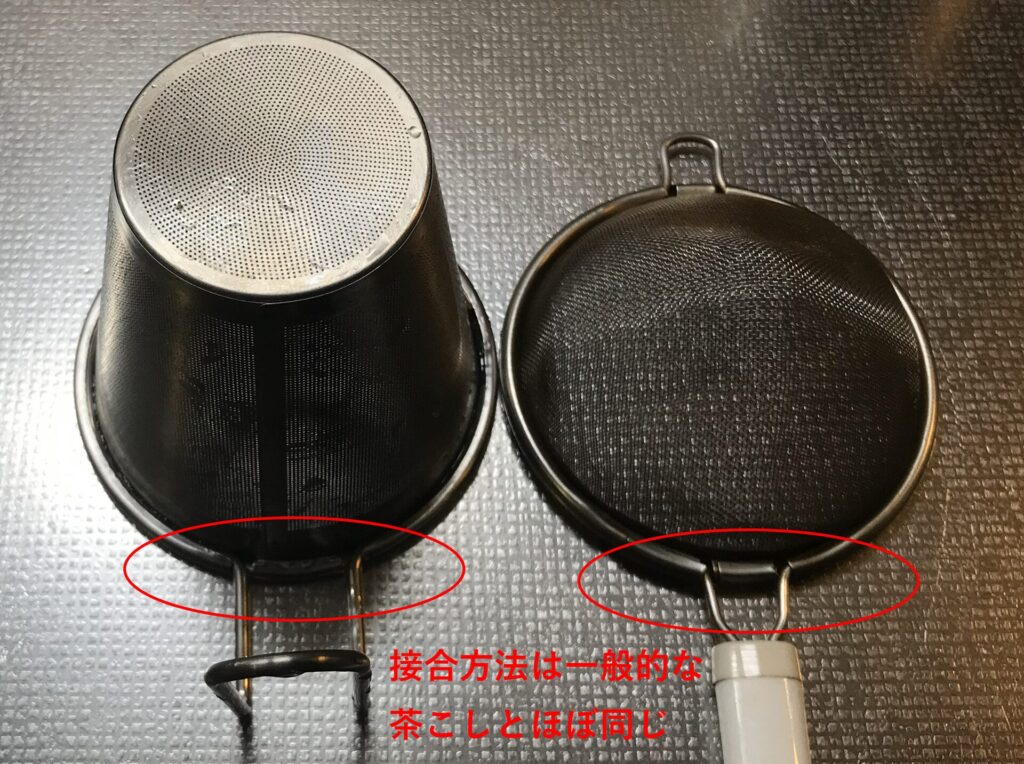 SS茶こし(手付)はステンレスの一体成形ではなく、パンチング加工の部分と柄の部分が接合されています。この接合部分は、一般的な茶こしと同じく、コップの縁のような部分をOKマークのような形にした金属で固定した構造です。
