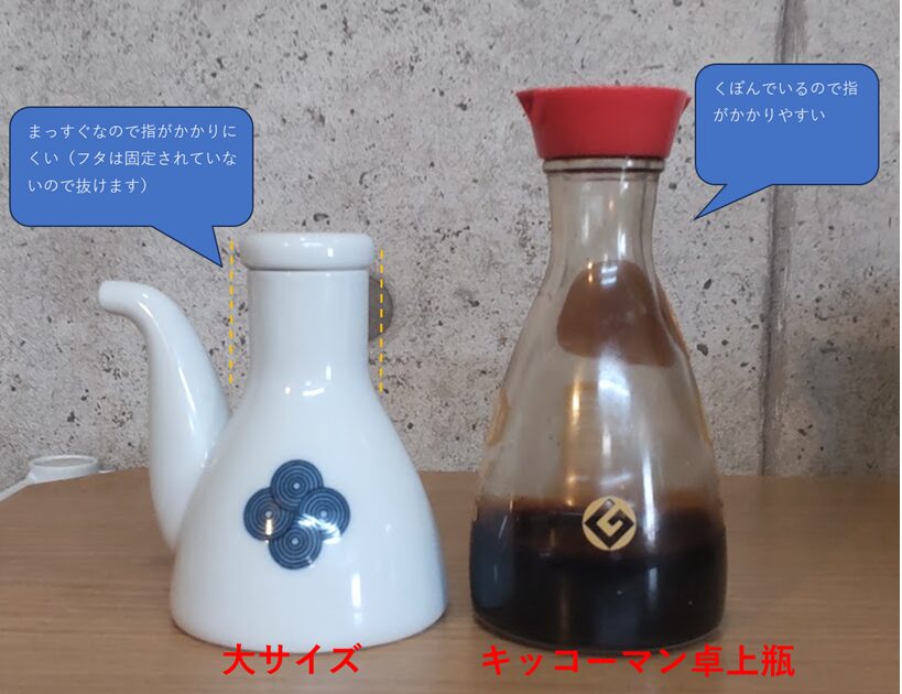 しかしながら、首部分を持って使う習慣がある人にとっては、柳宗理の醤油差しに少し不安を覚えることがあるかもしれません。例えば、キッコーマンの醤油瓶は首部分がくぼんでいるため指がひっかかりやすいのと比べると、柳宗理の醤油差しはストレートな形なので、同じ感覚では持ちにくく感じることがあります。