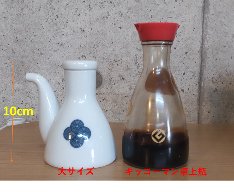 食卓で複数人が使うことが多いなら、大サイズが選びやすいです。柳宗理が1975年に設計した大サイズは100ccで、当時の一般的な容量感を踏まえたサイズでした。ちなみに、キッコーマンの醤油瓶(卓上瓶)は150mlです。